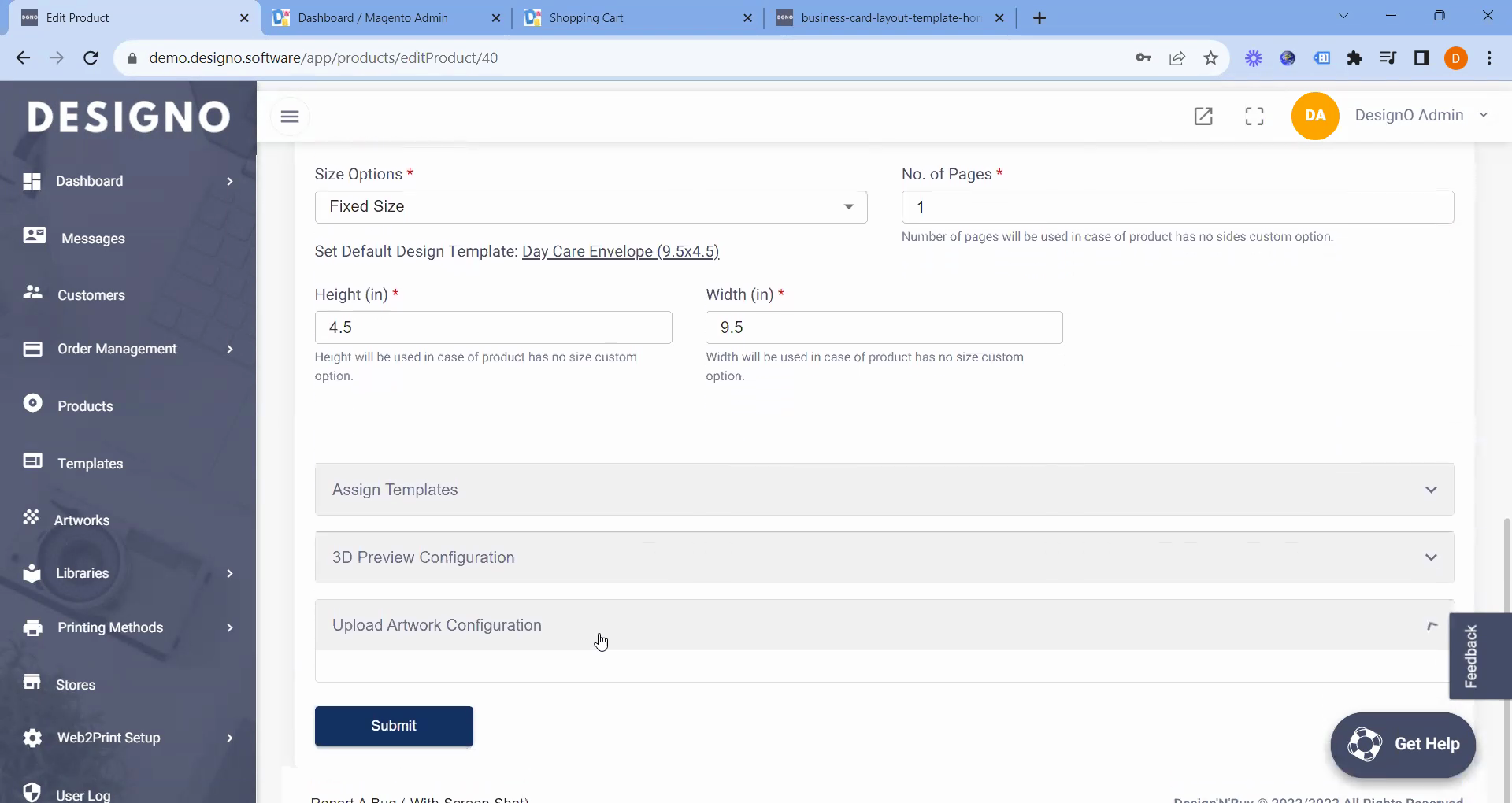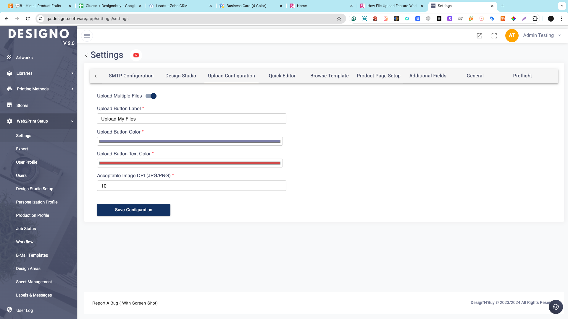 Additionally, you can access the "Web2Print Setup," click on "Settings," and proceed to the "Upload Configuration" tab.