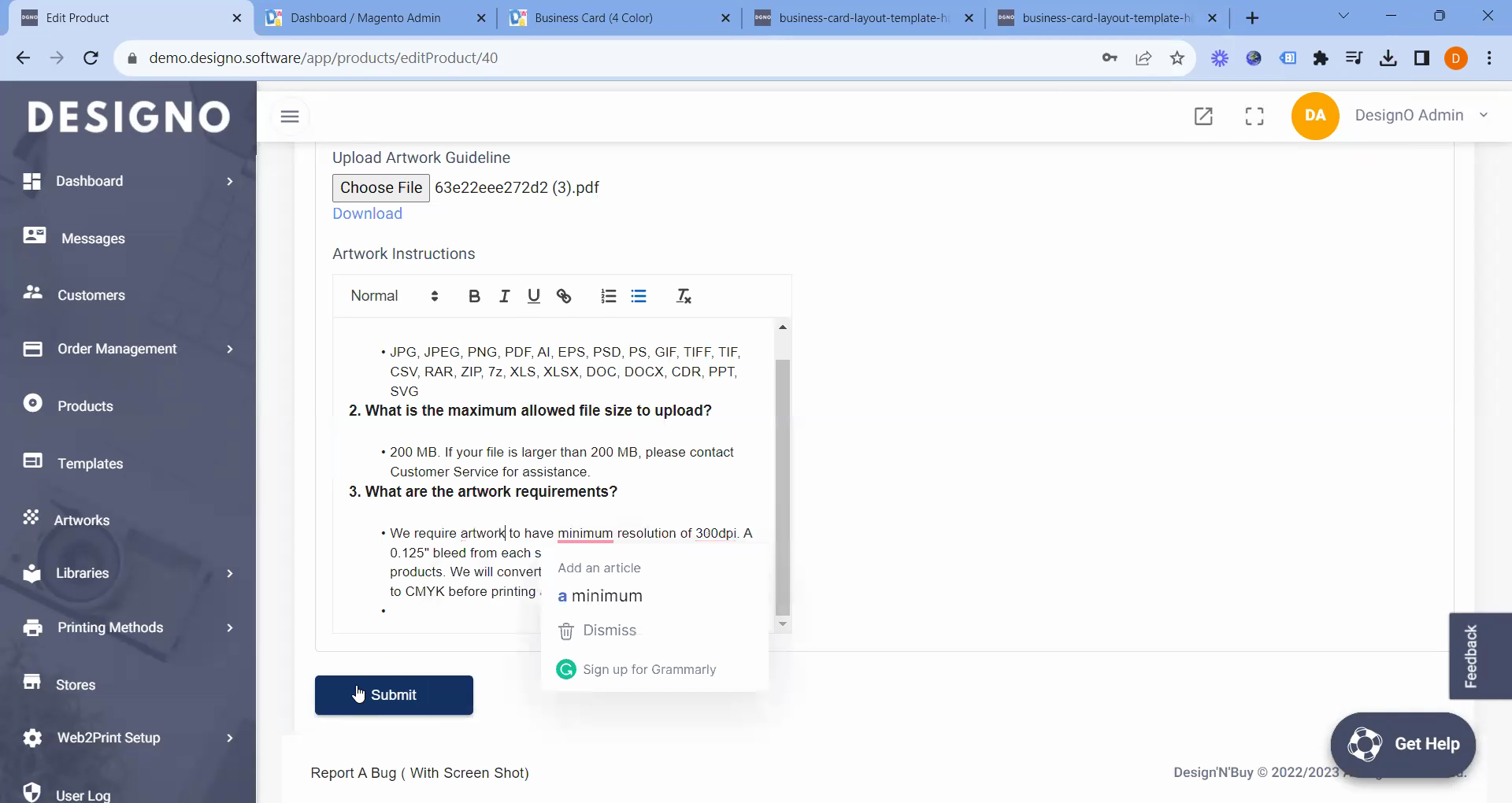 Users can edit the upload settings to provide specific instructions or recommendations about file formats. Additionally, it informs users about the maximum file size allowed, which is 205 MB. For files exceeding this limit, customers are advised to contact customer service for assistance. Another critical aspect covered is the artwork requirements, specifying a minimum resolution of 300 DPI for uploaded files. This ensures that all submissions meet the necessary quality standards for commercial printing.