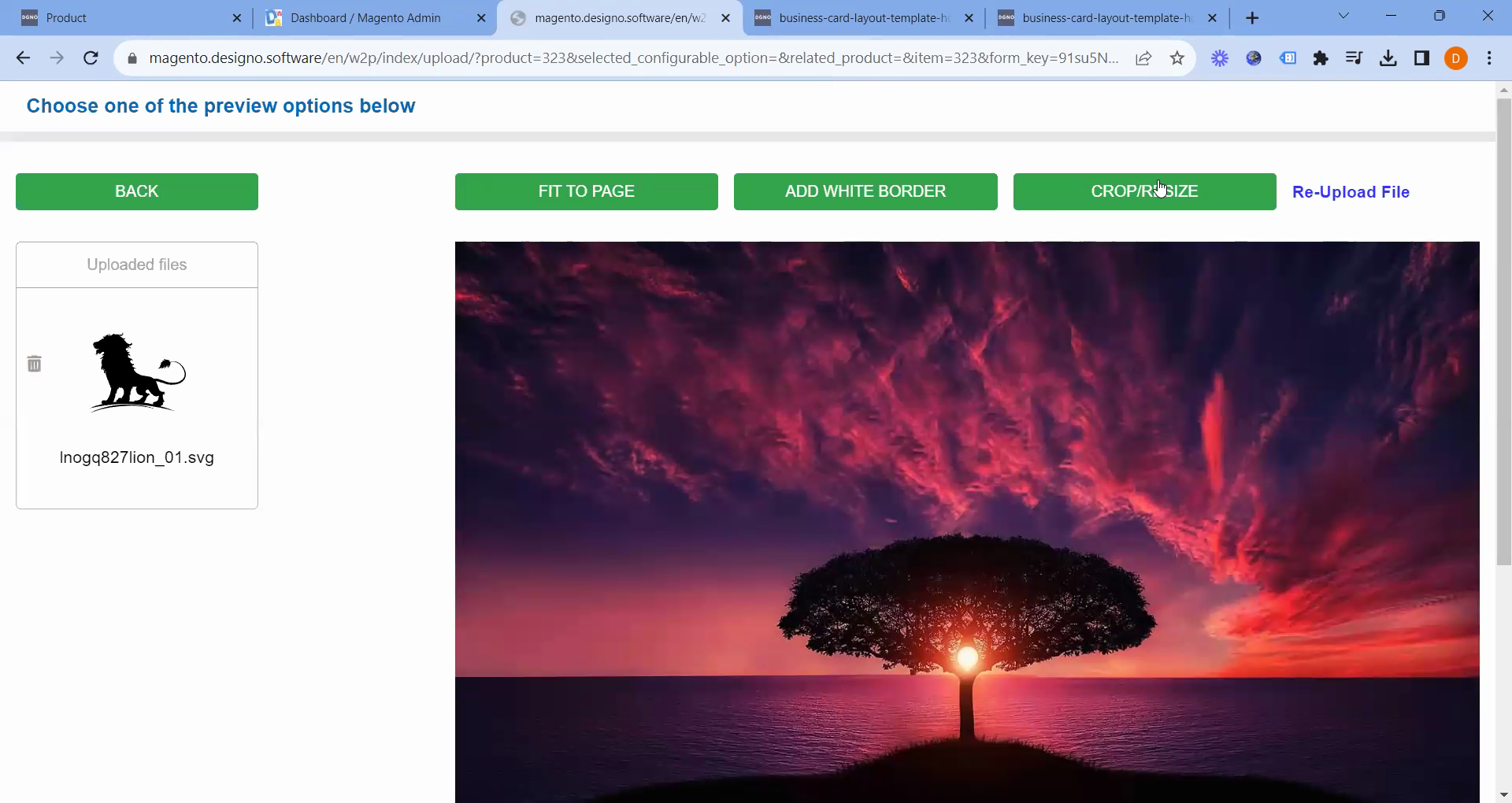 Upon proceeding to the next step, the system has already uploaded the artwork file. On the following page, it displays the photo, offering options to fit it to the page, add a white border, or crop and resize.
