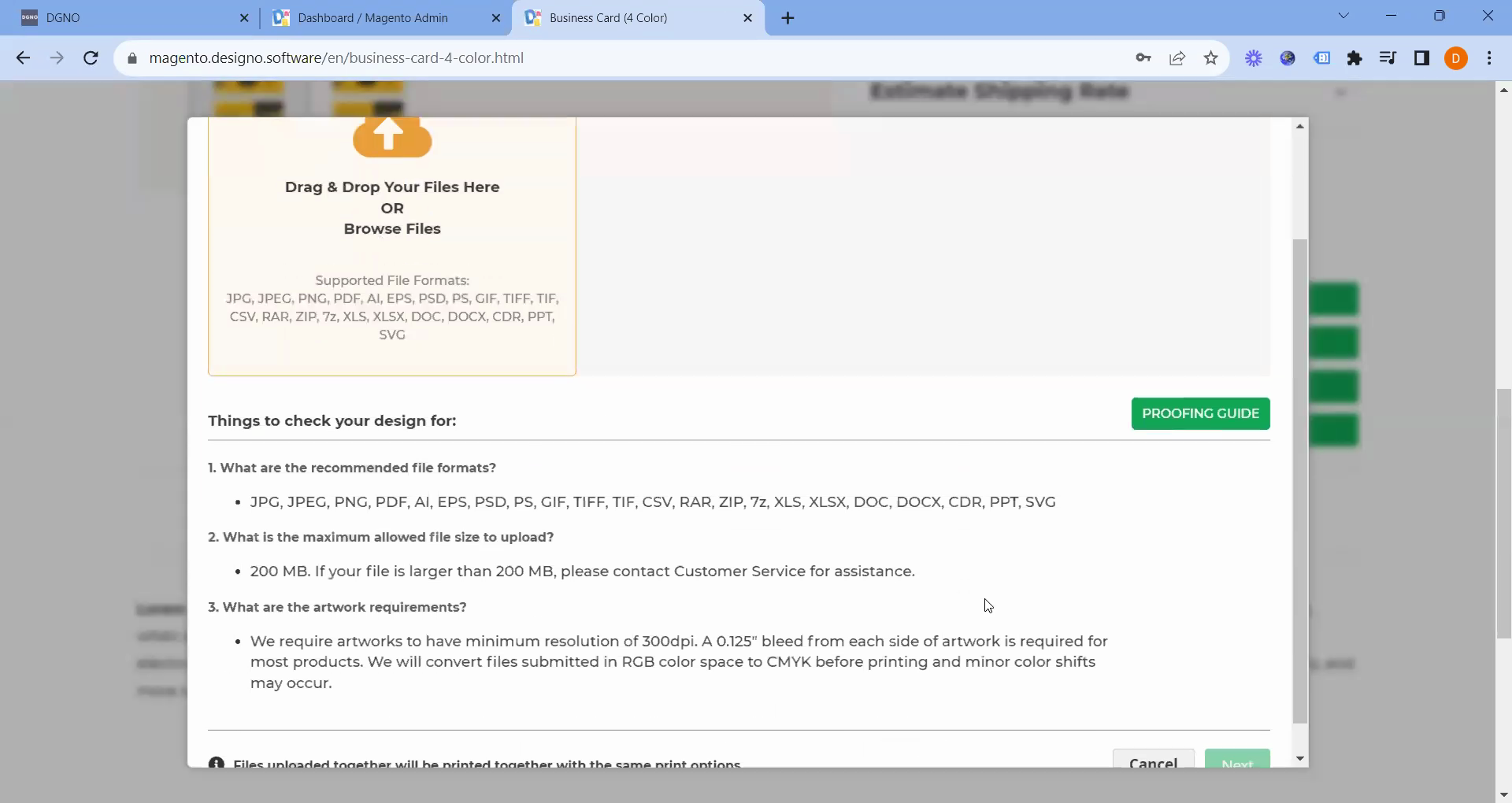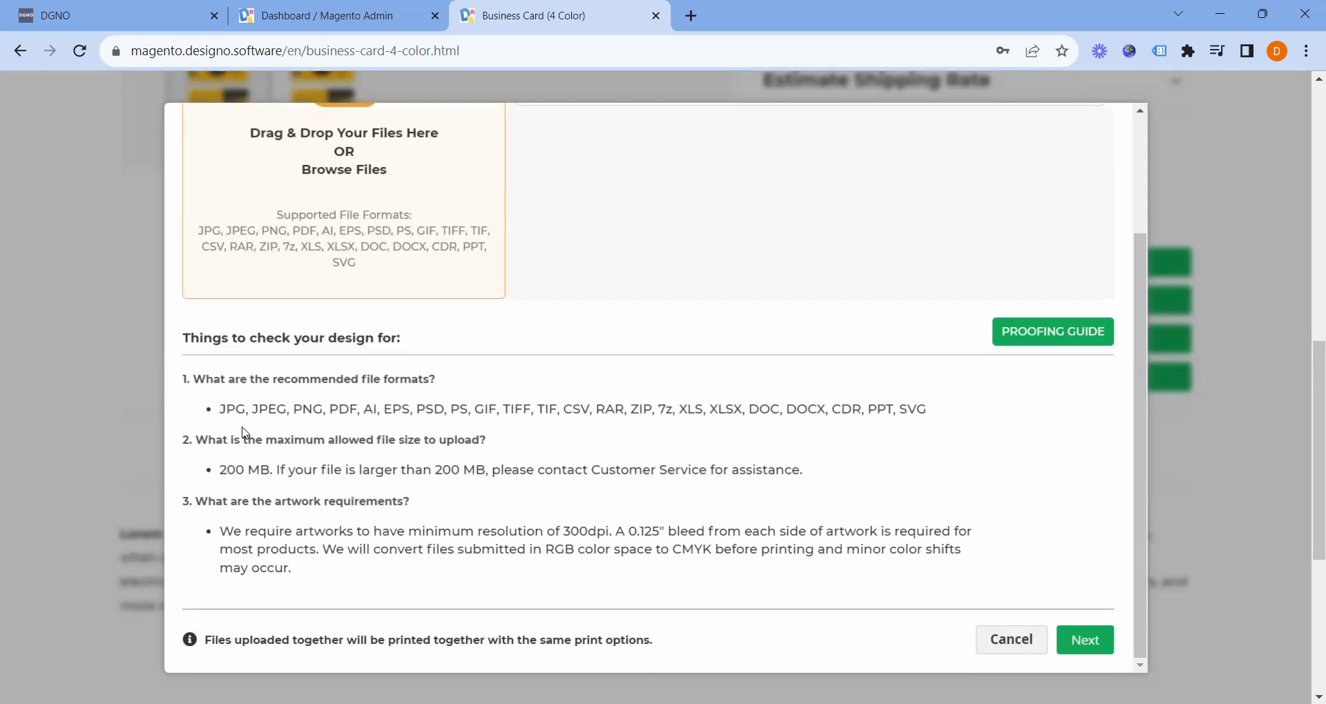 Following that, you will find the PDF of the proofing guide, which is available for use. The next step involves returning to the business card section to utilize the same PDF file. To do this, click on the "Browse" button, then select the "Upload File" option.