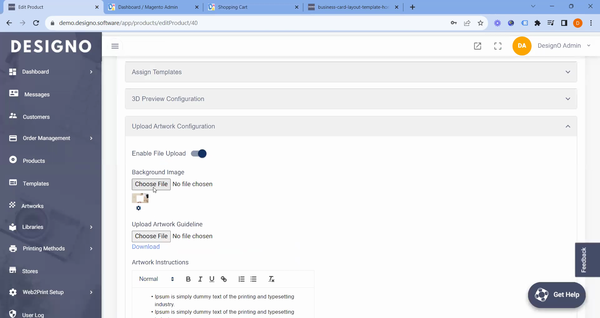 The next step click on "Upload Artwork Configuration" and enable "Enable File Upload" toggle