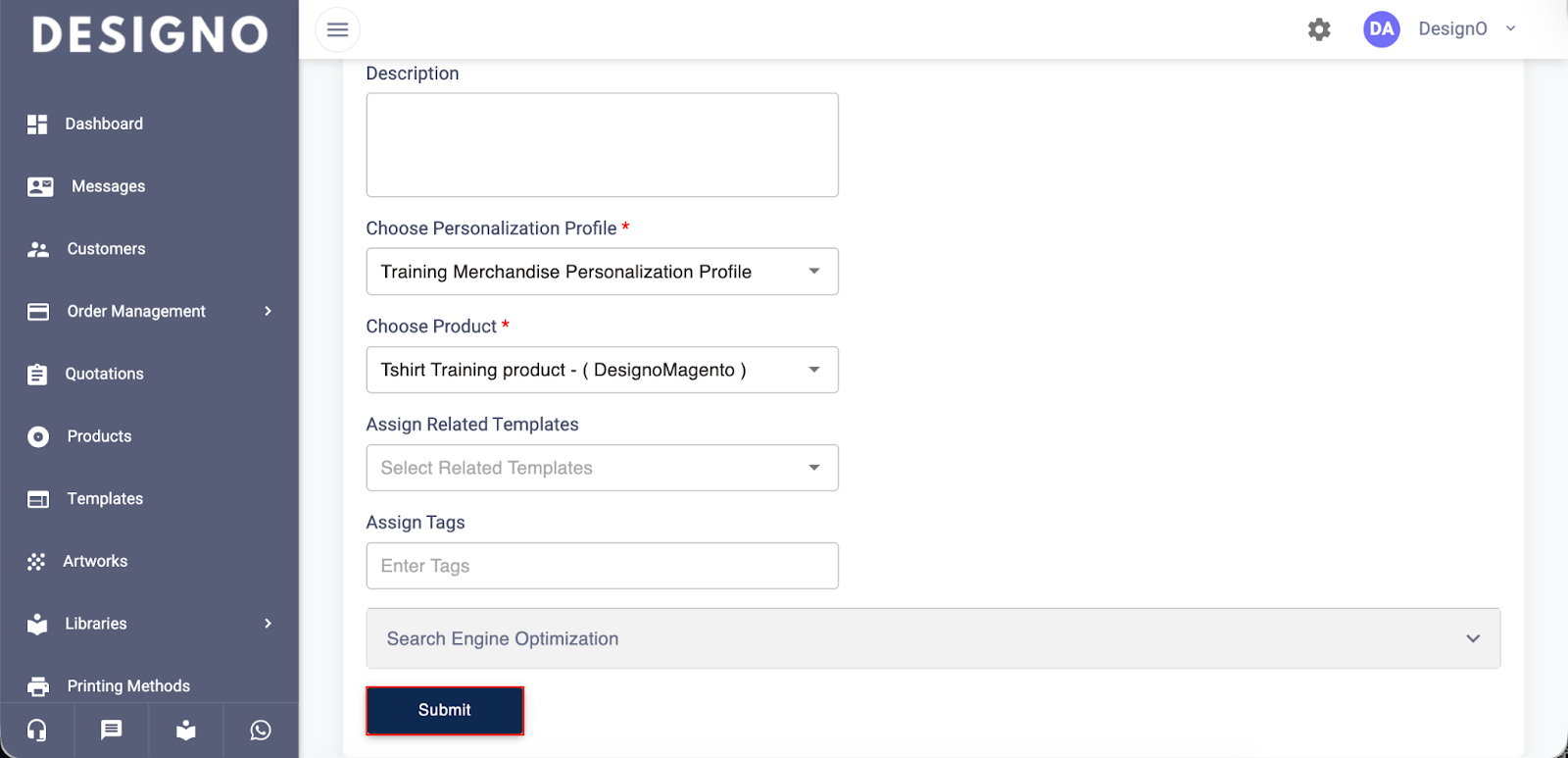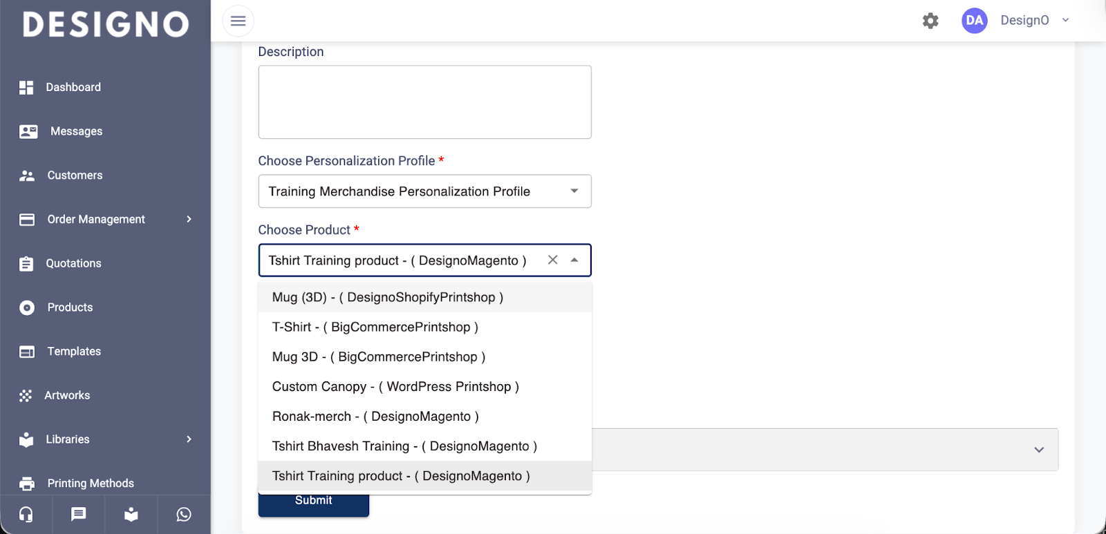 Step 5: Select the product for which the template is being created. In this instance, it's a t-shirt. Click Submit.