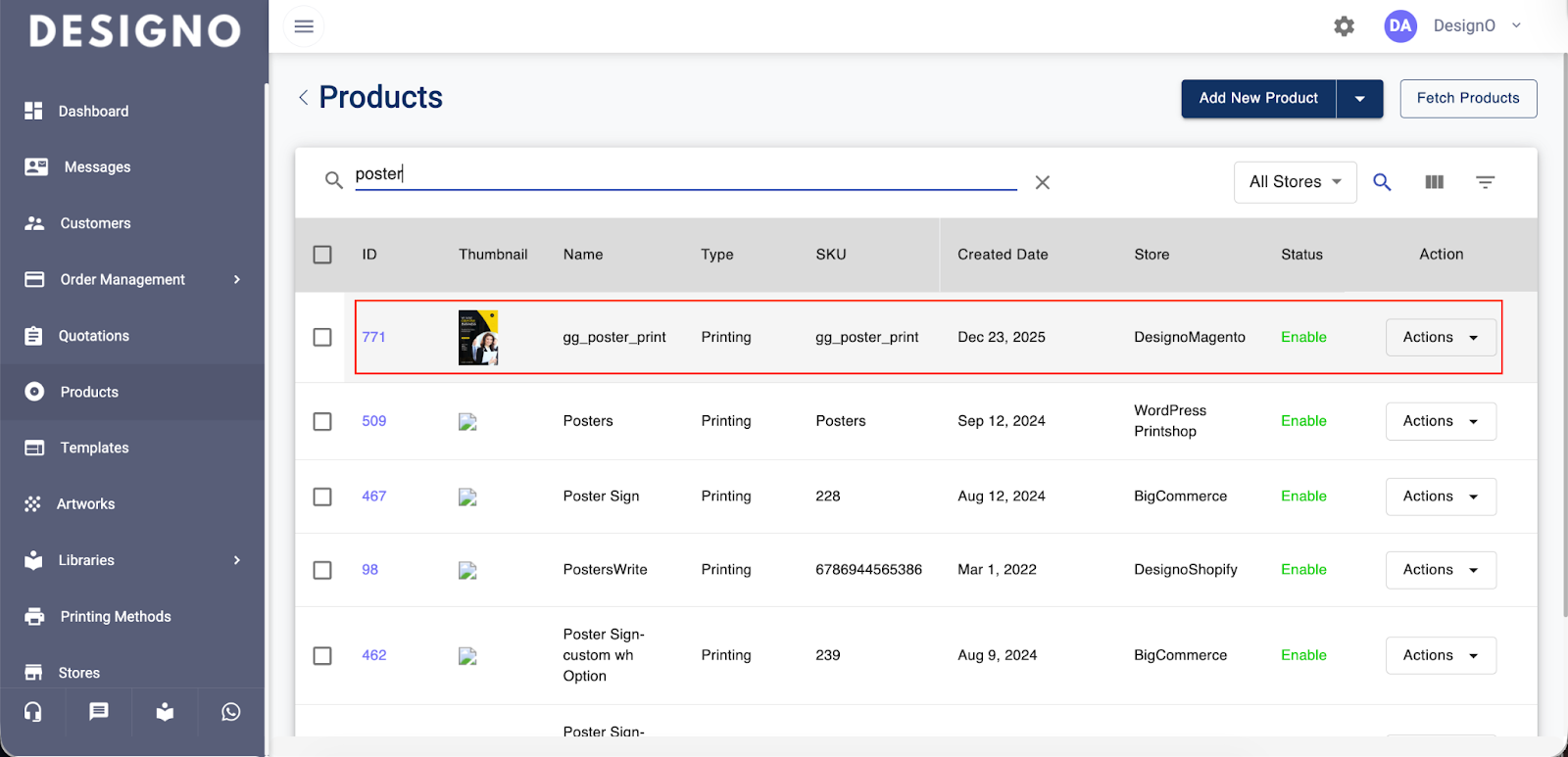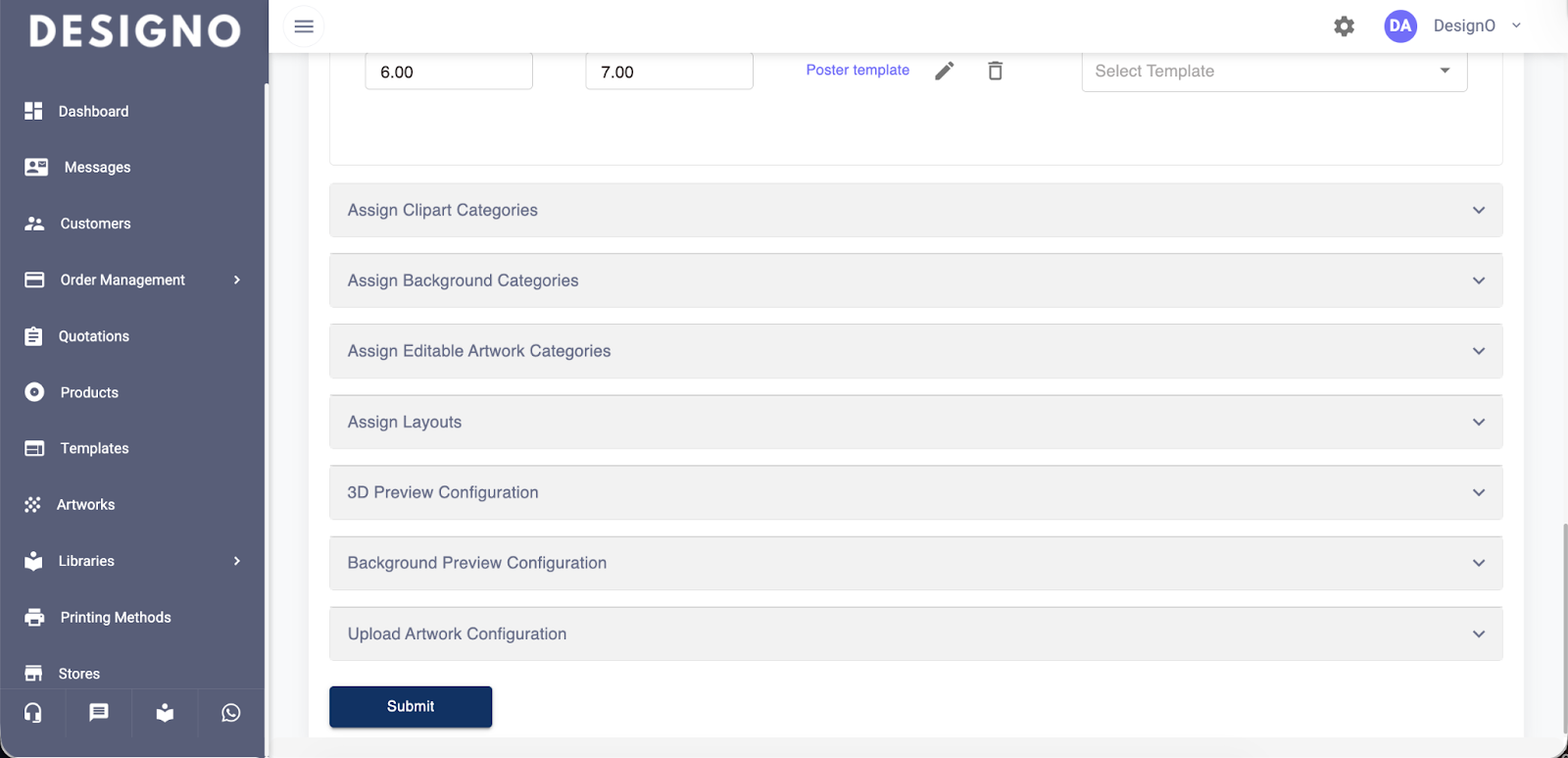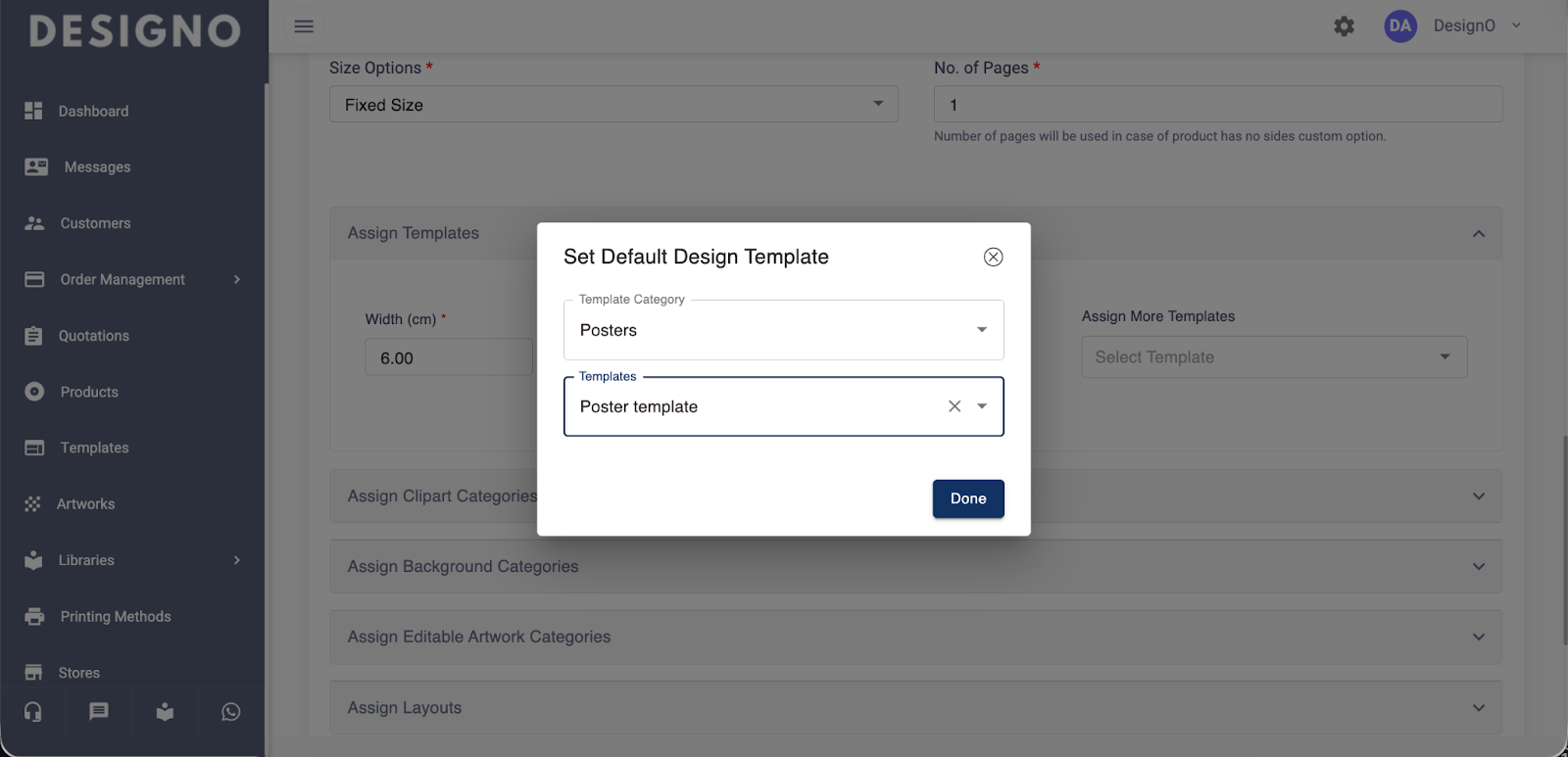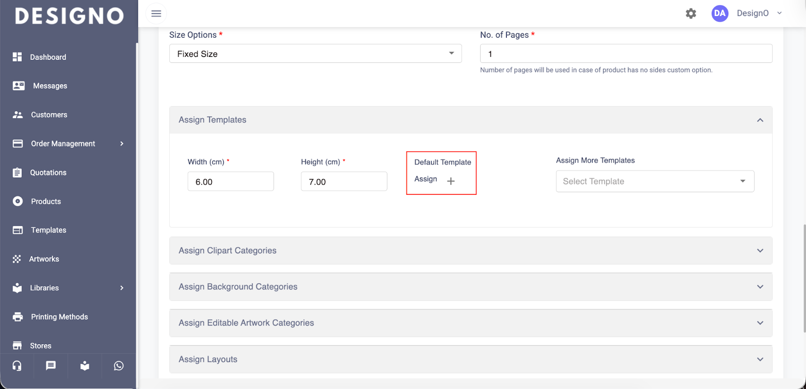 Step 12: Go to your product and select assign templates. Here, enter the width and height of the template you created and then click on assign default template.
