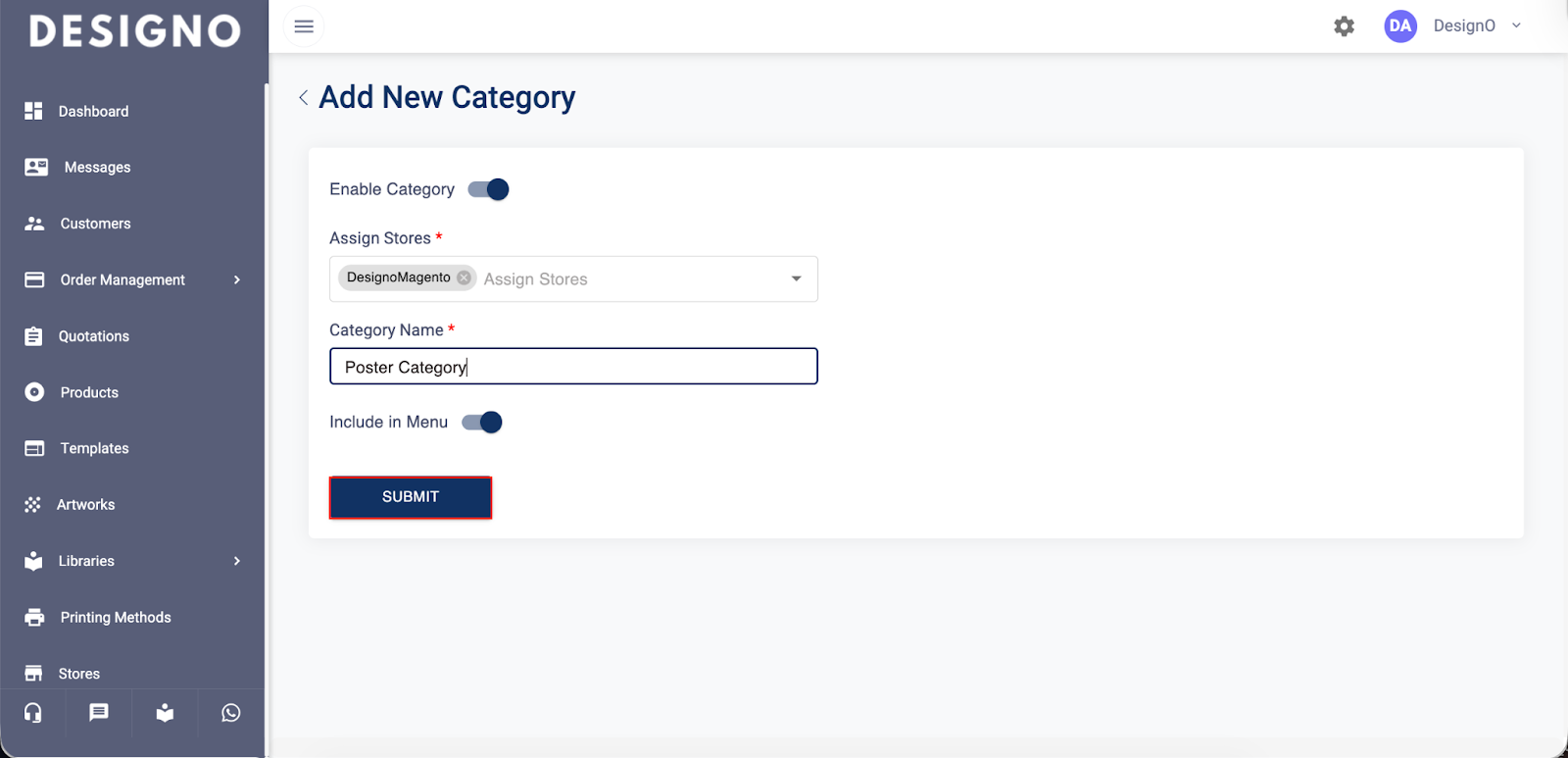 Step 17: Ensure the enable category option is on, then hit submit. Your new category will now be visible.