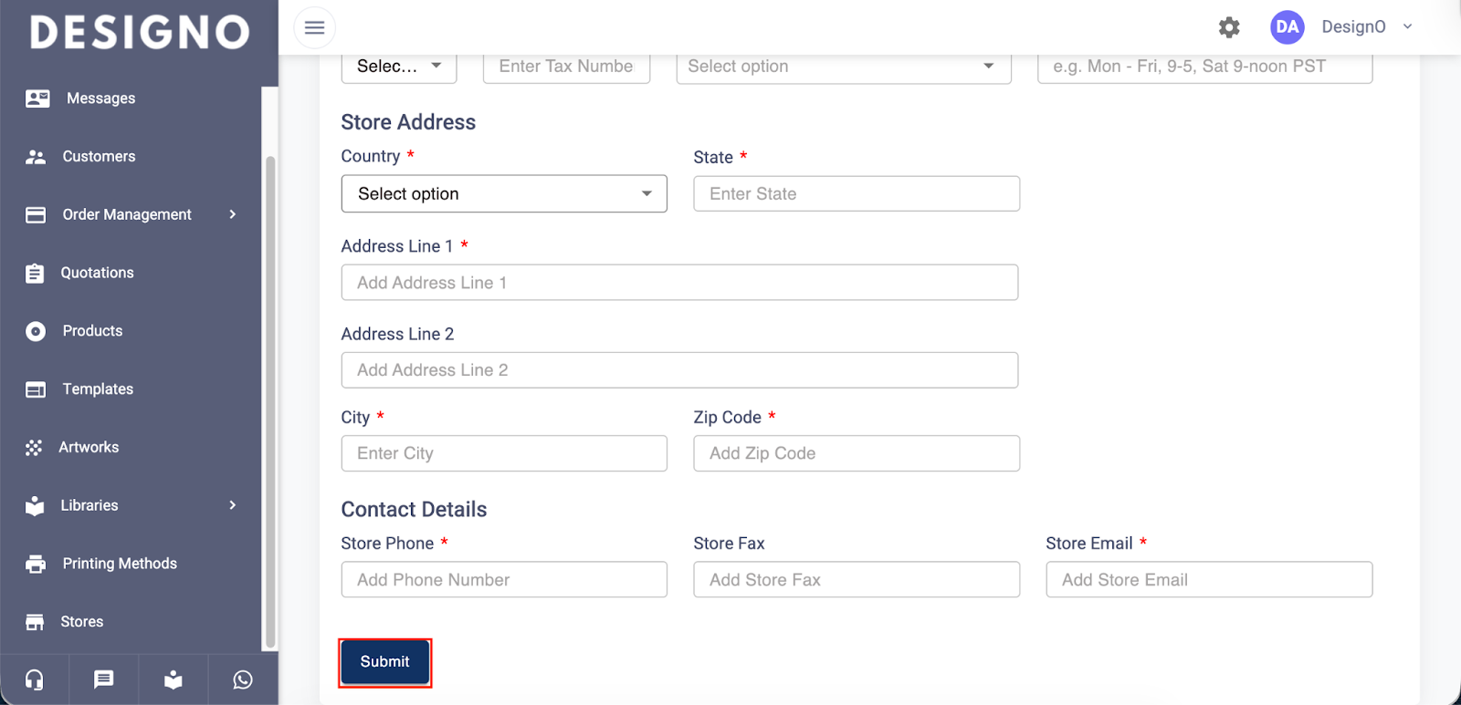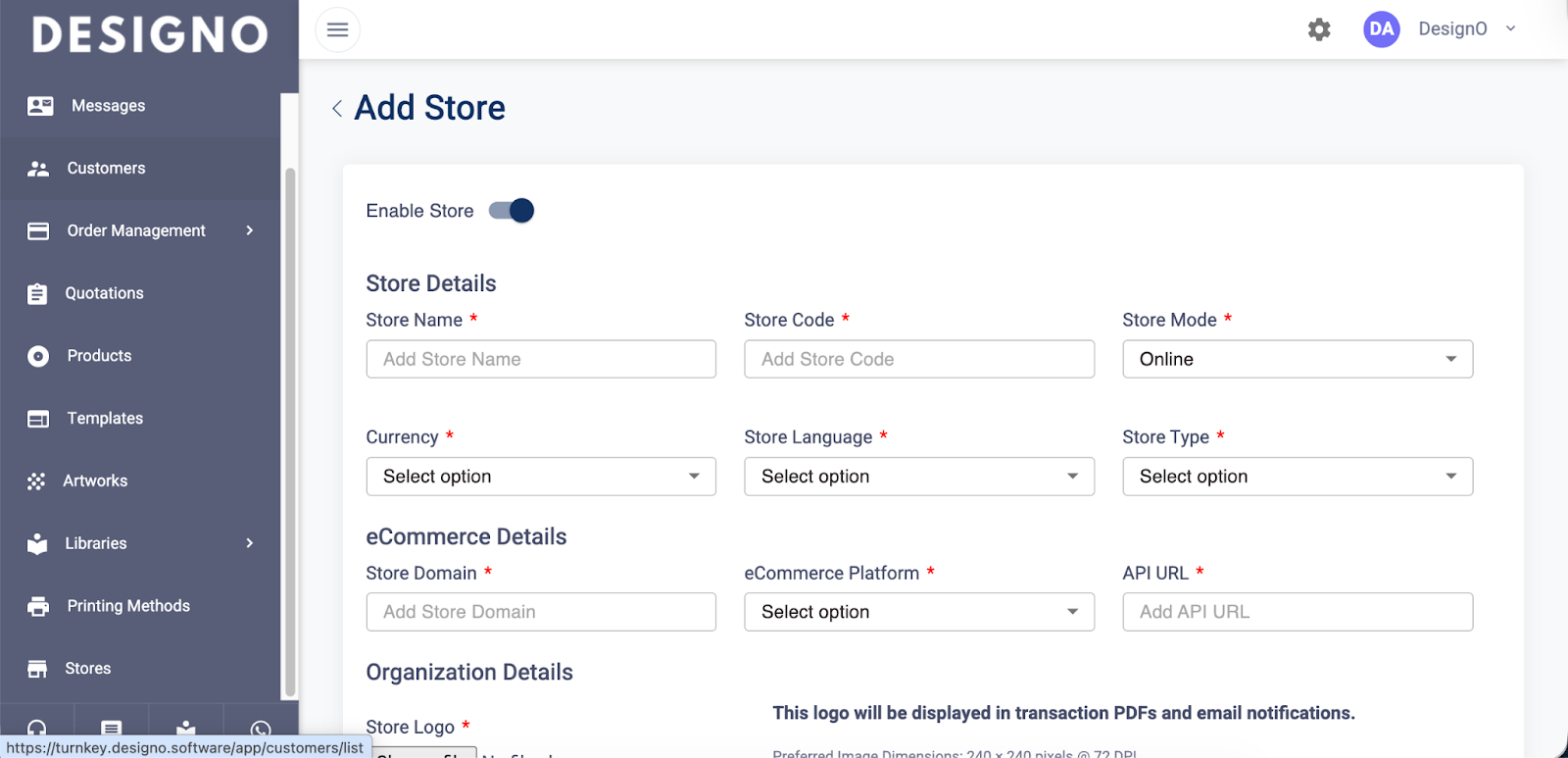 Below is a complete step-by-step guide to add, configure, and manage a store in DesignO.