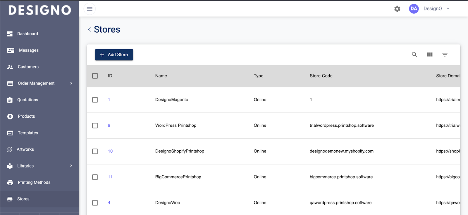 Once added, DesignO lets you manage stores built on different platforms (Magento, Shopify, WordPress) centrally.